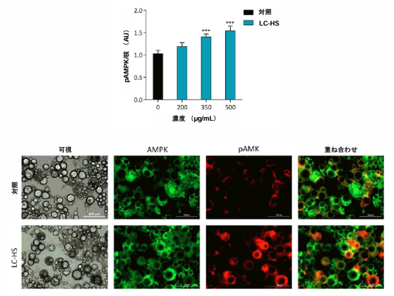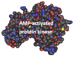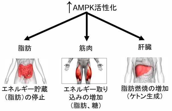 AMPKは、細胞のエネルギー状態の恒常性に関係する酵素で、動物が全て持っている酵素です。細胞のエネルギーが低下している時に、グルコースと脂肪酸の取り込みと酸化を活性化する「代謝スイッチ」として機能します。活性化により代謝を向上するので、新たな脂肪の蓄積を防ぎます。肥満状態では、このAMPKの活性は低下しているので、脂肪が蓄積します。