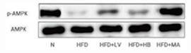 マウスの実験ですが、高脂肪食によりAMPKの活性が減少する事が知られています。右図を見て下さい。左側の標準食を食べているマウス(N)は、ある程度活性があります。左から2番目、高脂肪食を食べているマウス(HFD)では、AMPKの活性が落ちています。一番右側は、高脂肪食+メタノレードを与えられたマウス(HFD+MA)では、AMPKの活性が標準食の時よりも上がっています。メタボレートは脂肪組織中のAMPK活性を促進しますが、これはレモンバーベナ単独(HFD+LV)やハイビスカス単独(HFD+HB)よりも強い効果を示しました。