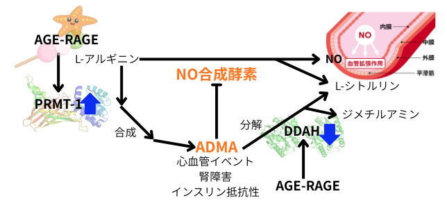 非対称ジメチルアルギニン(Asymmeteric dimethylarginen:ADMA)は、一酸化窒素合成酵素NOの内因性阻害物質です。血管内皮細胞に蓄積すると、一酸化窒素(美容通信2025年9月号)の合成が阻害され、正常な血管内皮細胞の機能が失われる為、高血圧や動脈硬化、心筋梗塞、脳卒中等の発症や進展に関与することが示唆されています。 その為、ADMAは、心血管疾患の危険因子として注目されており、特に慢性腎臓病(美容通信2026年10月号)患者に於ける心血管イベントの重要な危険因子と考えられています。