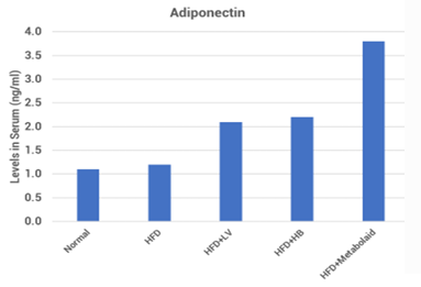 アディポネクチンは脂肪細胞から分泌されて、脂肪の燃焼を活性化したり、糖の取込みを活性化するホルモンです。従って、その分泌低下は、肥満やメタボリックシンドロームに関与します。メタボレードを摂取すると、高脂肪食を与えたマウスでも、アディポネクチンの分泌が上昇します。