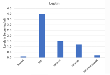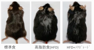 レプチンも脂肪細胞から分泌されますが、満腹を感じるホルモンで、食欲抑制や脂肪蓄積の抑制に関与します。しかし、脂肪細胞が増えた肥満状態ではレプチン抵抗性となり、食欲に歯止めが効かなくなり、過食や体重増加のデブ街道を邁進する羽目に陥ってしまいます。マウスの実験では、高脂肪食により、レプチンの血中濃度が増加して、レプチン抵抗性の状態にあっても、メタボレードを投与すると、レプチンの血中濃度が、正常食のマウスと同程度レベルにまで低下しました。