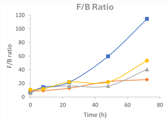 近年、腸内フローラは健康維持に重要な役割を果たし、特にFirmicutes門とBacteroidetes門が全体の約9割を占め、そのバランス(F/B比)は、肥満や代謝疾患、炎症性腸疾患等に関与すると報告されています。Firmicutesは短鎖脂肪酸産生やエネルギー収穫増大を通じて肥満傾向との関連が示唆され、一方でBacteroidetesは食物繊維分解を介して代謝バランス改善や炎症抑制に寄与すると注目されています。メタボレード添加により、F/B比(肥満指数)が低下しました。