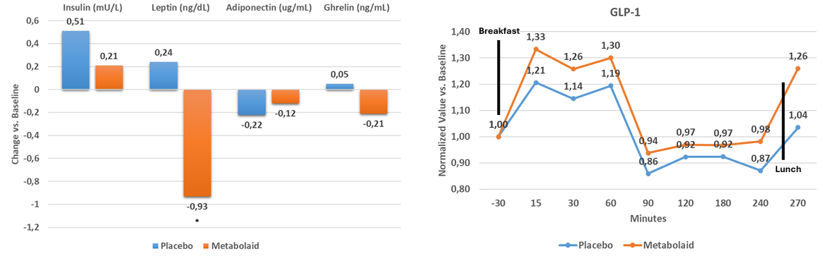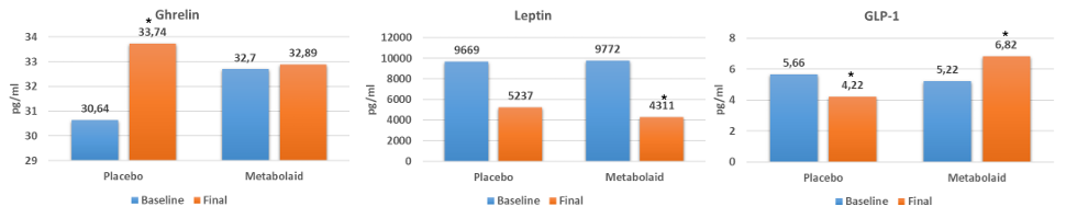 主観的満腹感評価(VASスケール)では、満腹感が15~20日目から上昇始めたのと反対に、空腹感は減少。血中のホルモン濃度の分析では、空腹感を誘導するホルモンであるグレリンに関しては、プラセボ群では+10%としっかり増えていますが、メタボレード群では、殆ど変化がありませんでした。満腹感を誘導するGLP-1の分泌量は、メタボレード摂取群では有意にしっかり上昇(+30%)しているのに対し、プラセボ群では逆に減少(-25%)。レプチンは肥満で高値を示しますが、メタボレード摂取群では有意に減少(-56%)しました。