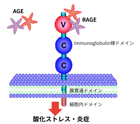 因みに、現在では、RAGEに結合する物質は、AGE以外にも沢山ある事が分かっています。例えば、癌細胞の転移に関与しているとされるHMGB1や、アルツハイマー病の際に神経細胞を傷害するアミロイドβ蛋白質等も、AGEのようにRAGEに結合しし、酸化ストレス・炎症を惹起し、病状を悪化させます。