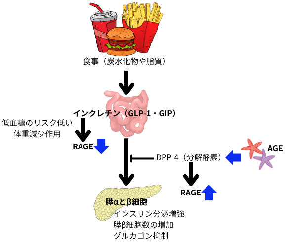 インスリンは血糖値を下げるホルモンであり、膵臓から分泌されます。また、体内には食物の摂取後、インスリン分泌を促すインクレチン(GLP-1などの消化管ホルモンの総称)がありますが、GLP-1はインクレチンの一つで、前述の通り、膵臓にはGLP-1が作用するGLP-1受容体があり、この受容体がGLP-1によって活性化し、インスリンを分泌させます。GLP-1は、DPP-4によって分解される為、血中半減期は12分と短いのが特徴です。