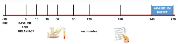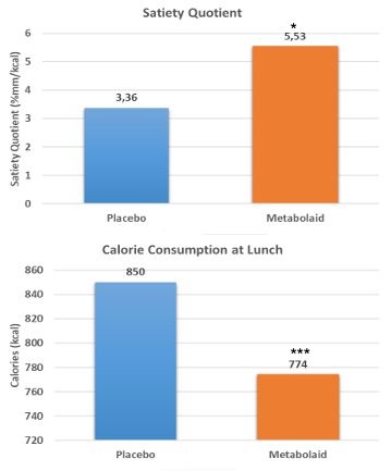 過体重又は1型肥満の成人男女を対象にした、二重盲検プラセボ対照クロスオーバー試験。食事や運動の介入はなし。メタボレードを60日間摂取した後の61日目に、食欲/満腹感の認識評価(VASスケール)、血液検査(消化管ホルモン、脂質/糖質のプロフィール)、身体測定を行いました。