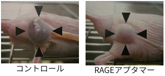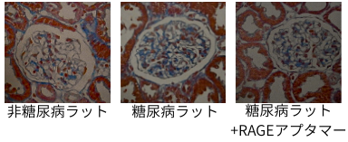 左図は、RAGEアプタマーを実験動物に投与した際の腎臓の組織写真ですが、糖尿病性腎症の発症が抑えられるだけでなく(=予防)、腎症の進行も抑えられ(=治療)ているのが分かります(Diabetes 2017; 66: 1683-95)。