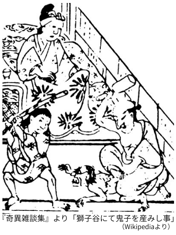 貞享時代の怪談本『奇異雑談集』には、京都東山の獅子谷という村で、ある女が異物を3度分娩した末に4度目に鬼子を産んだ話があります。この子供は生誕時にして、既に3歳児程の大きさで、朱のように真っ赤な色で、両目に加えて額に目があり、耳まで裂けた口の上下に歯が2本ずつ生えていたそうです。この鬼子は、父に殺されそうになりながら噛みついて抵抗したものの、ついに殺害されて崖下に埋められてしまいますが、翌日になって生き返り、話を聞いていた周囲の人たちに殴りつけられ、ようやく息絶えたんだとか…。