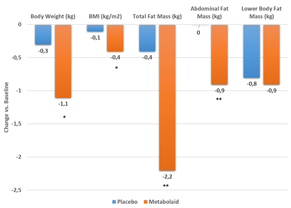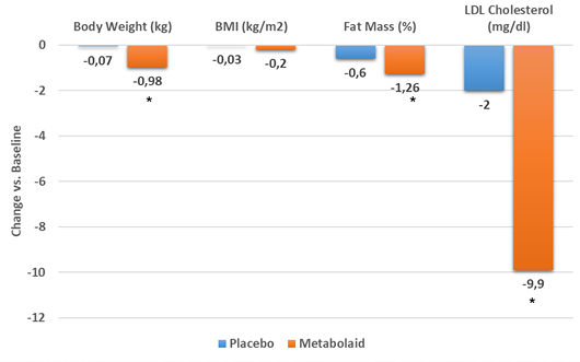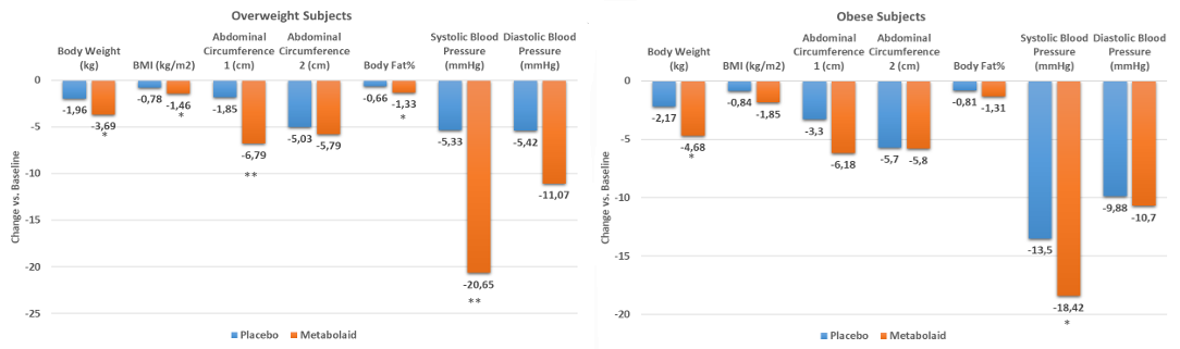 プラセボ群(青)もメタボレード摂取群(オレンジ)も、食事と運動の介入を行っているので、プラセボ群でも体重の減少が認められますが、そこに更にメタボレードの摂取を加えると、体重、BMI、腹部周囲径、体脂肪量については2倍、収縮期血圧に関しては何倍も、有意に下がっています。