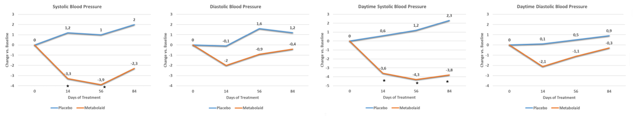 高血圧予備軍!(降圧剤を飲んでいる人は除外)を対象にした二重盲検プラセボ対照試験で、ホルター法(連続血圧測定)による血圧の評価を行いました。食事や運動の介入はありません。