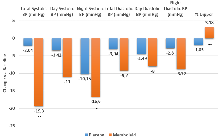 ④の試験よりも血圧が元々高い人が多い人が対象の為、血圧の低下が著しい結果になっています。血圧は、様々な因子により変動します。正常人の血圧は、昼間に比べ夜間睡眠中には10~20%低下し、午前3時頃に最低となった後、覚醒に先駆けて、早朝から午前中にかけて上昇します。この夜間の血圧低下をdipping現象と呼びます。この昼間の血圧と夜間の血圧の差があまりない場合は、心臓病のリスクが上がる事が知られていますが、メタボレードの摂取によって、dipper(夜間血圧の自然な低下)型への改善が認められました。昼間の血圧も下がりますが、より夜間の血圧が下がり、dipper率が改善して、心臓病のリスクも下がるのではないかと考えられています。