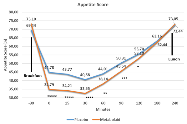 メタボレード群(オレンジ)では、プラセボ群(青)と比較して、朝食の30分前から、朝食後120分までの食欲スコアが有意に低下を示しました。