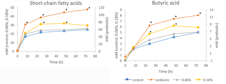 また、短鎖脂肪酸は、腸内細菌が食物繊維(難消化性糖類)を発酵する際に産生され、健康維持に欠かせない役割を果たしている事が知られています。短鎖脂肪酸の受容体が全身の様々な部位にあり、短鎖脂肪酸はこれらの部位の生体調節機能を果たしています。中には生活習慣病と密接な関係にあるものも多い事から、癌や肥満、糖尿病、免疫疾患を予防・治療する手段として、近年活発に研究されている分野でもあります。メタボレード添加により、短鎖脂肪酸の産生が用量依存的に増加し、酢酸、プロピオン酸、酪酸の3種が代表的な短鎖脂肪酸ですが、特に酪酸Butyric acid(美容通信2012年8月号)の増加が著明になりました。酪酸は大腸上皮細胞のエネルギー源として利用され、この増加は、相乗効果的に、更なる腸内細菌叢の改善に寄与するものと思われます。