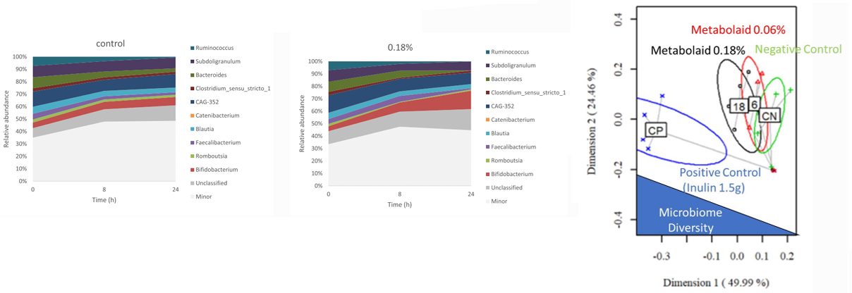 In vitro大腸消化モデルでの試験。腸内細菌叢(美容通信2024年8月号)を比較した試験で、メタボレードの添加により、糞便中の腸内細菌がどの様に推移したかを調べました。