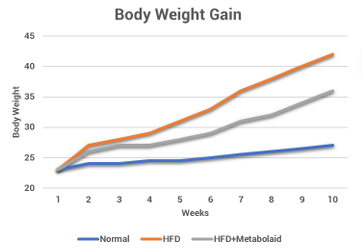 メタボレードは、このエネルギーギャップを軽減させます。GLP-1の上昇により空腹感は減りますが、AMPKの活性により代謝は上昇しますから、「食欲が減少して、代謝が上がっている」=エネルギーギャップが縮小するのです。その結果、マウスの実験ではありますが、オレンジ色の高脂肪食を食べているマウスでは、体重がどんどん増えているのに対し、青色は標準食を食べているマウスですが、この両者の間の灰色の高脂肪食を食べているけれど、メタボレードを摂取しているマウスでは、所謂高脂肪食だけを食べているマウスよりも、可なり体重の増加が抑制出来ました。