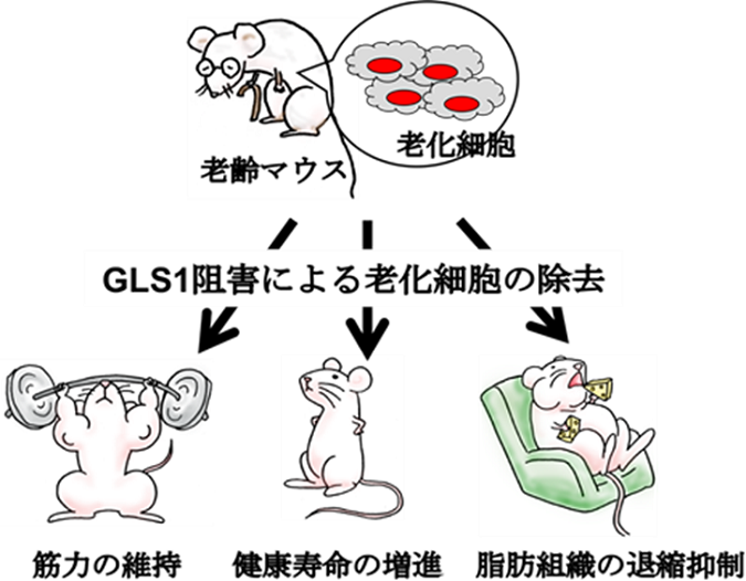 加齢現象に対するGLS1阻害剤の有効性を検証する為に、老齢マウスにGLS1阻害剤を投与した実験では、様々な臓器・組織に於いて老化細胞の除去が確認でき、加齢性変化の特徴として知られている腎臓の糸球体硬化、肺の線維化、更には肝臓の炎症細胞浸潤と言った様々な症状が改善することが可能であることが分かりました。また、老化に伴う筋量低下による運動能力低下や、脂肪組織萎縮による代謝異常を生じることが知られていますが、GLS1阻害剤の投与により、これらの進行も抑制されました。更に、様々な加齢関連疾患モデルマウスへGLS1阻害剤を投与したところ、肥満性糖尿病、動脈硬化、及びNASH(非アルコール性脂肪性肝炎)の症状が緩和される事も分かりました。