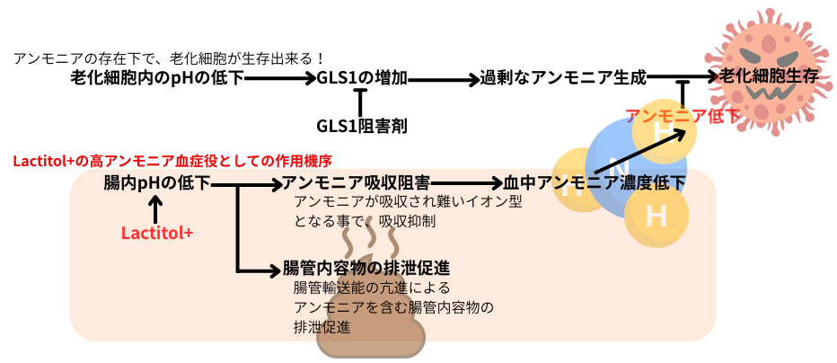 Lactitol+の作用機序は、下記の通り。老化細胞の生存を可能にする過剰なアンモニアの生成環境を是正する事で、老化細胞の除去を行う事を主眼に開発された、画期的な医療機関専売サプリメントです。