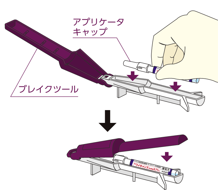 ②アプリケータキャップが外れていない事を確認し、図のようにアプリケータキャップがセットされるように、アプリケータをブレイクツールに置きます。