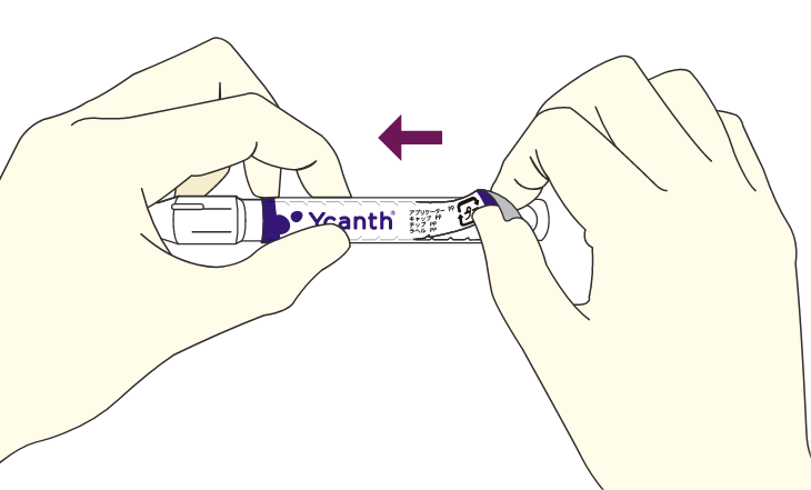 アプリケータに貼付されているラベルの⼀部をミシン⽬に沿って剥がします。この際、ガラスアンプル及びアプリケータに破損や異常がないのを確認します。