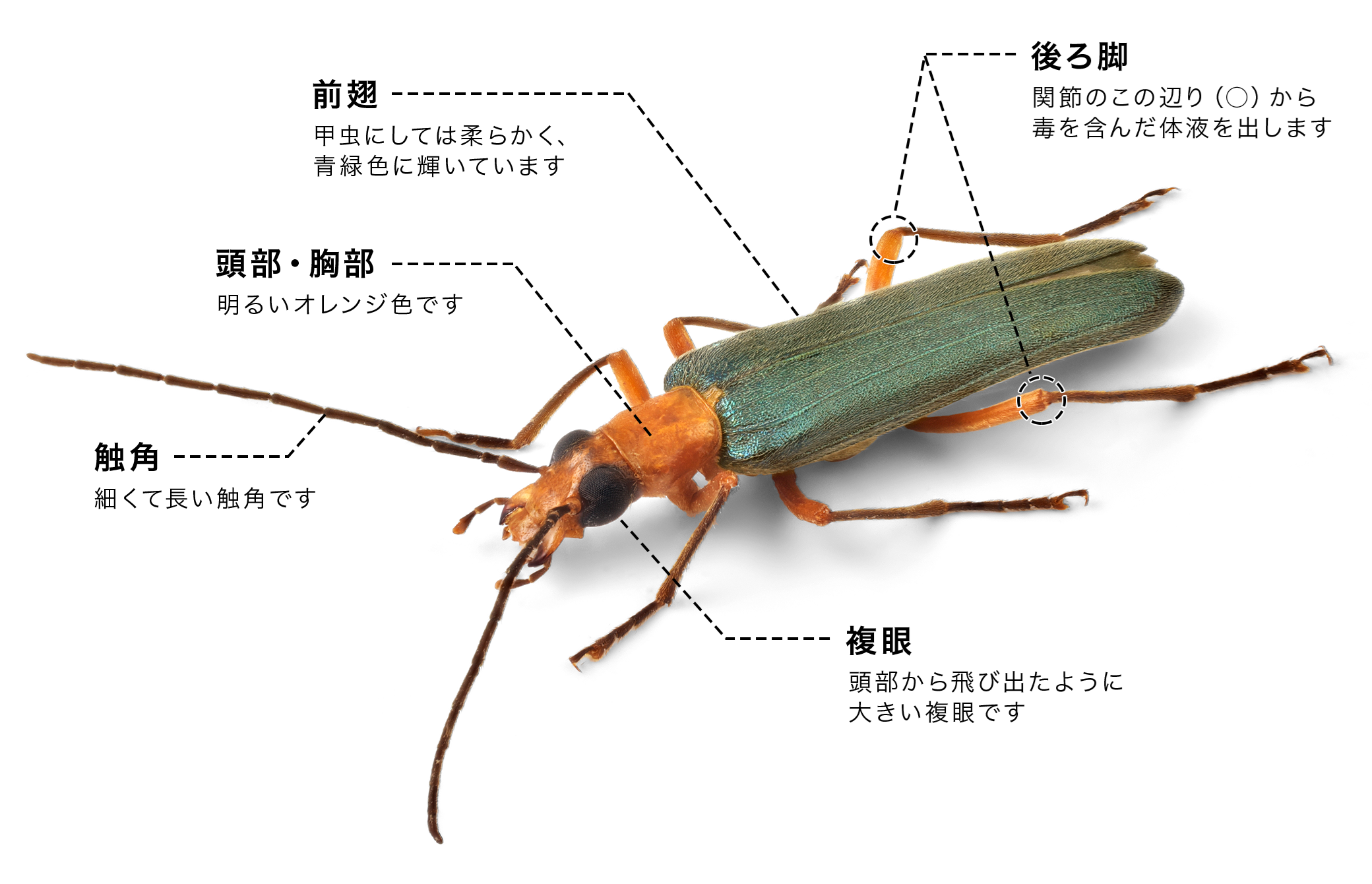 *カンタリジン:カルボン酸無水物を含む構造を持つ、エーテルテルペノイドに分類される有機化合物の一種。含有する昆虫の一つジョウカイボン科(Cantharidae)にちなみ命名されました。昇華性がある結晶で、水には殆ど溶けません。皮膚につくと痛みを感じ、水疱を生じます。ツチハンミョウ類、ジョウカイボン類、カミキリモドキ類、アリモドキ類、ハネカクシ類等の甲虫類が分泌する体液に含まれ、日本では、夜間に灯火に飛来するアオカミキリモドキによって皮膚に水疱を生じる事故が多い事で知られています。以下は、アース製薬の「キケンな虫の虫ケア図鑑」から拝借した図です。北海道にも生息しているようですが、昼行性のHSAKOと行動時間帯が違う所為か、未だに遭遇したことはありません。