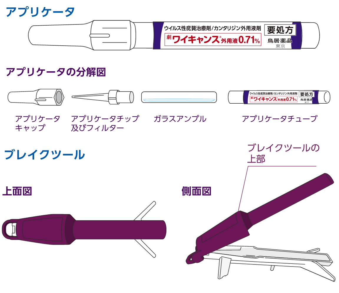 ワイキャンス®外⽤液0.71%のアプリケータの準備と本剤の使⽤⽅法を説明しておきます。医者や看護婦に一方的に押さえつけられて、何をされているのか分からないまま施術されるのでは、拷問でしかありませんからね(笑)。本剤の包装容器はアプリケータで、付属として、ブレイクツールを添付しています。アプリケータ内のガラスアンプルを付属のブレイクツールで破砕して使⽤します。