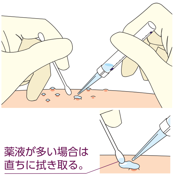 伝染性軟属腫病変部位に、アプリケータチップ(先端部分)で薬液を適量塗布します。この際、病変部位からはみ出さない様に、薬液を極く薄く(薄いフィルム状)乗せる様に塗布します。もし、塗布時に出過ぎてしまった薬液や病変部位以外の⽪膚に付着してしまった薬液は、綿棒やガーゼで直ちに拭き取ります。塗布部位を可能な限り⽔平に保つのが上手に塗るコツなので、患者さんの協力が非常に大切な行程になります。