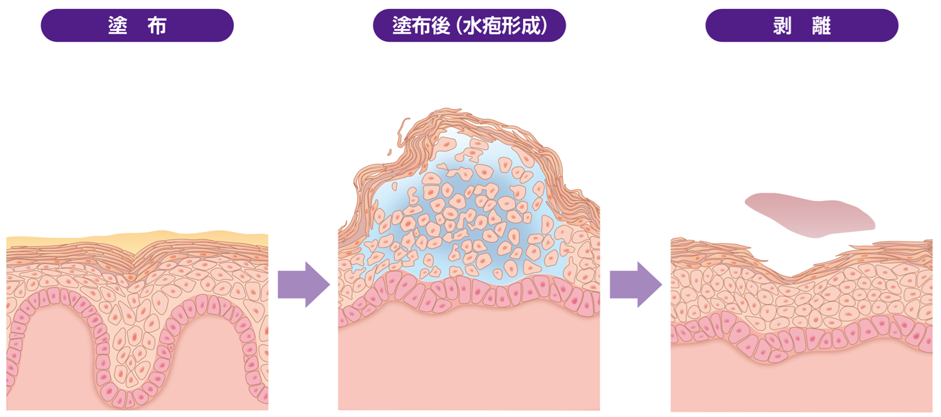 塗布16~24時間後に、石鹸を用いて水で洗い流して本剤を除去します。塗布部位には、局所皮膚反応として水疱や紅斑、腫脹、疼痛、掻痒等が発現します。まあ、その強烈な反応こそが作用の本態ですから、起こって当然と言うか…起こってくんないと困るとも言えますが、激しい!!!!!!!!痛み等が発現した場合は、塗布16~24時間後より前でも石鹸を用いて水で洗い流し、直ちにクリニックにご連絡下さいね。