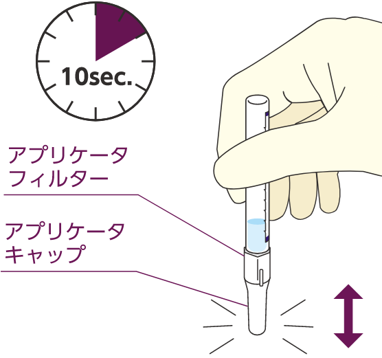 アプリケータキャップを下に向けて持ち、約10秒間優しく、丁寧に、軽く叩きます。薬液がアプリケータフィルターの上に集まるまで、タッピングします。