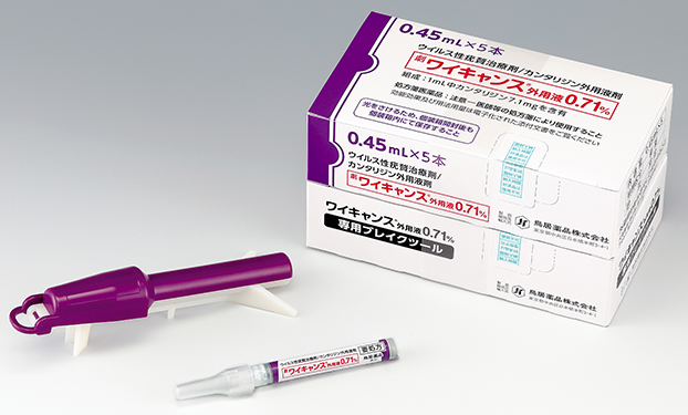 ワイキャンス外溶液0.71%(一般名:カンタリジン)は、伝染性軟属腫(Molluscum Contagiosum)の治療薬として承認された、本邦初の薬剤です。将来的には、尋常性疣贅(イボ)の治療薬としての認可を狙っていると、鳥居製薬の営業が申しておりました(←実は、こちらの方が本命らしい)。